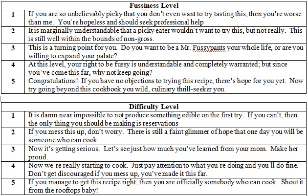 Every recipe can be gauged on two separate scales of 1 to 5. Determine how likely or unlikely a picky eater will enjoy the recipe using the Fussiness Scale; and figure out what sort of chance a novice chef has of successfully preparing the recipe by using the Difficulty Scale.